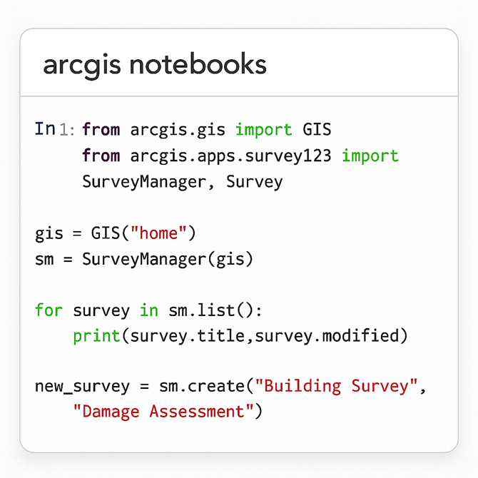 Learn how to create and publish ArcGIS Survey123 surveys using notebooks and ArcGIS API for Python.