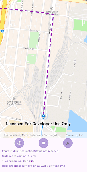 Tap the play button to simulate travel and receive directions from a preset starting point to a preset destination. Observe how the route is recalculated if the simulation deviates from the suggested path. You should hear voice directions when maneuver instructions are available. You can stop or restart the simulated movement and recenter the navigation.
