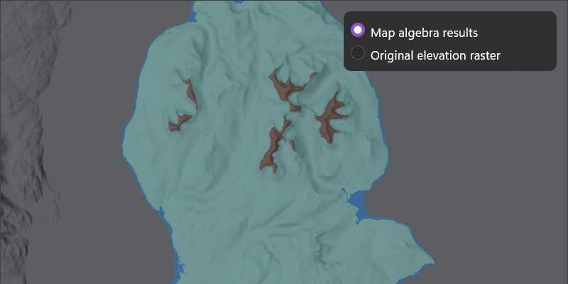 ContinuousField,DiscreteField, orBooleanFieldcan be visualized in aFieldAnalysisfor immediate feedback. The visualization updates automatically when function parameters change. These types also allow you to export the result to a new raster dataset for later use or further analysis. When displaying results in a map or scene, apply an appropriate renderer to effectively visualize the data, such as aStretchRendererfor continuous data or aColormapRendererfor discrete or boolean data.