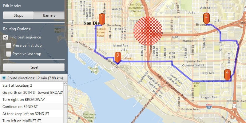 Route task parameters specify how a route should be found. There are many parameters that let you customize how the route is determined. Parameters include stops and barriers. Other parameters include travel mode, whether stops map be reordered to find an optimized route, the units to be used in the turn-by-turn directions (miles or kilometers, for example), and so on.