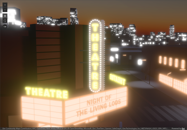 Add light emitters to the scene by configuring Symbol3DEmissive property in Symbol3DMaterial on volumetric symbol layers, or by including 3D models with emission defined (for example, via emissive maps or materials with an emissive color or factor). See the Visualization with light-emitting symbols sample to learn how to use emissive materials and glow to highlight features and build nighttime scenes.