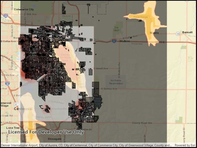 This sample features a Aurora Colorado GeoPackage that holds datasets that cover Aurora, Colorado. It has various data including Public art (points), Bike trails (lines), Subdivisions (polygons), Airport noise (raster), and liquor license density (raster).