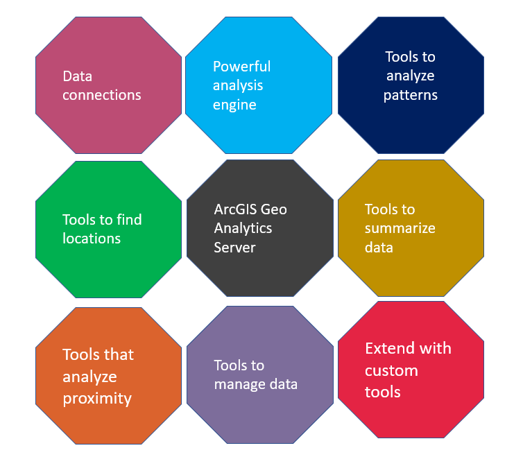 GeoAnalytics Server works with your vector (points, lines, and polygons) and tabular data and can read directly from CSV files, .txt files, shapefiles, and big data sources, such as cloud storage, HDFS, and Hive. GeoAnalytics Server also works with your existing GIS data, using feature layers as input.