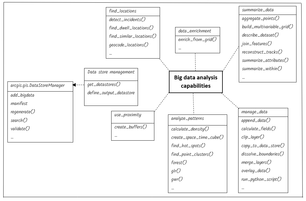 The arcgis.geoanalytics module available in ArcGIS API for Python provides submodules, data types, classes and functions to process your big data using an ArcGIS GeoAnalytics Server. The ArcGIS GeoAnalytics Server enables distributed analysis across multiple ArcGIS Server machines. You can analyze more data in less time because you harness the compute power of multiple machines. Navigate to the Get Started with GeoAnalytics Server page to learn how to configure the GeoAnalytics Server with your ArcGIS Enterprise deployment.