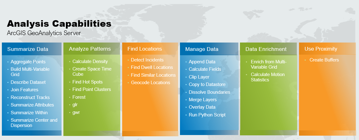 The arcgis.geoanalytics module provides types and functions for distributed analysis of large datasets. These GeoAnalytics tools work with big data registered in the GIS's datastores as well as with the feature layers.