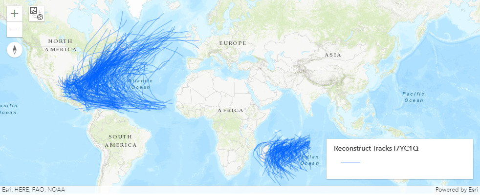 from arcgis.geoanalytics.summarize_data import reconstruct_tracksThis example aggregates numerous points into line segments showing the tracks followed by the hurricanes. The tool creates a feature layer item as an output that can be accessed once the processing is complete.