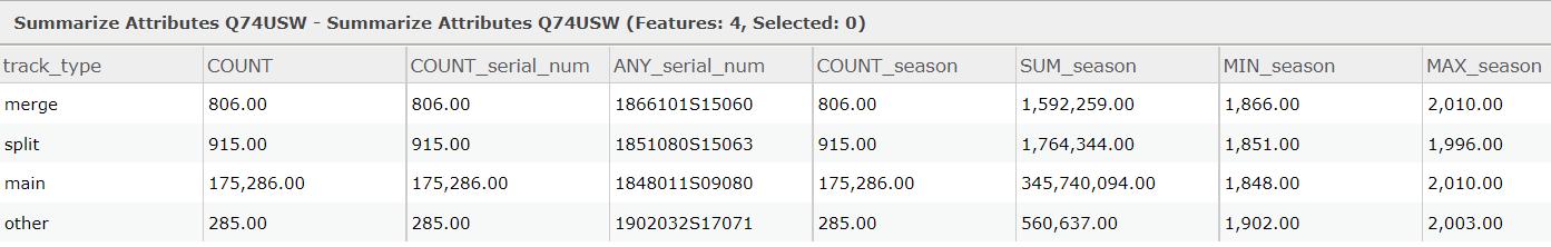 The Summarize Attributes tool summarizes like field values to generate a summary table. The resulting layer displays the count of features that have been summarized, as well as any additional statistics that have been specified.