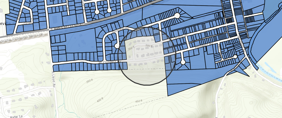 m.center = [39.9975, -75.7173]Query the Feature for a specific subdivision. Currently, there are no features for this subdivision. You will be adding the features for subdivision as PB 11 PG 48 to the parcels feature layer for Downingtown, PA using the append features workflow.