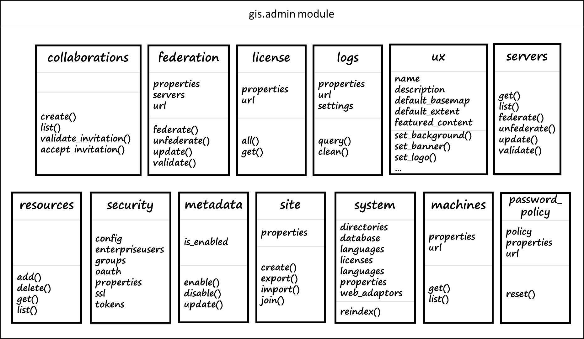 The gis module acts as a representation of your GIS. It forms the entry point to your scripts and gives you the ability to manage users, groups and content. Version 1.2 introduces a new admin submodule for the gis module which provides GIS administrators the ability to accomplish much more administrative tasks such as creating collaborations, managing ArcGIS Servers, licenses, security and customizing the look and feel of your GIS.
