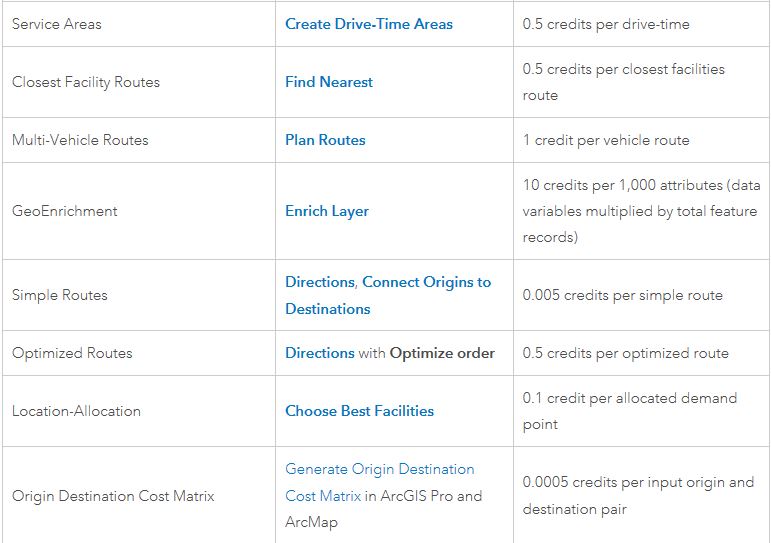 Fig 2. Credits consumed by network analysis services. Please refer to developers website or ArcGIS help doc for more information with credits.