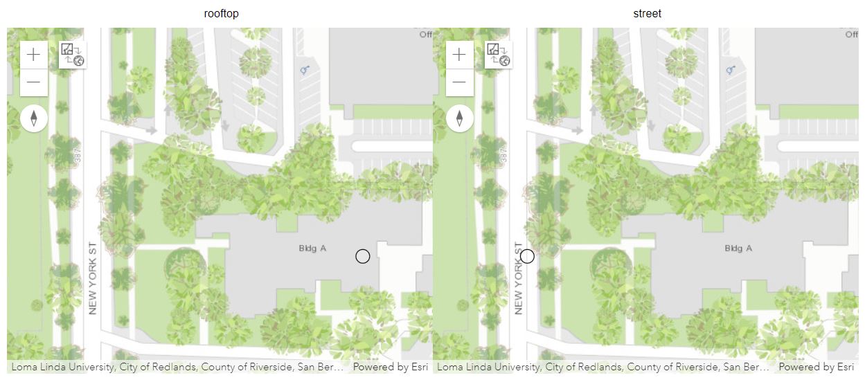 As what will see in the example below, when location_type="rooftop", map rendering of the specific point uses rooftop, which reflects the detailed location of PointAddress better. When location_type="street", map rendering of the returned geocoded result usually polts the point at the street.