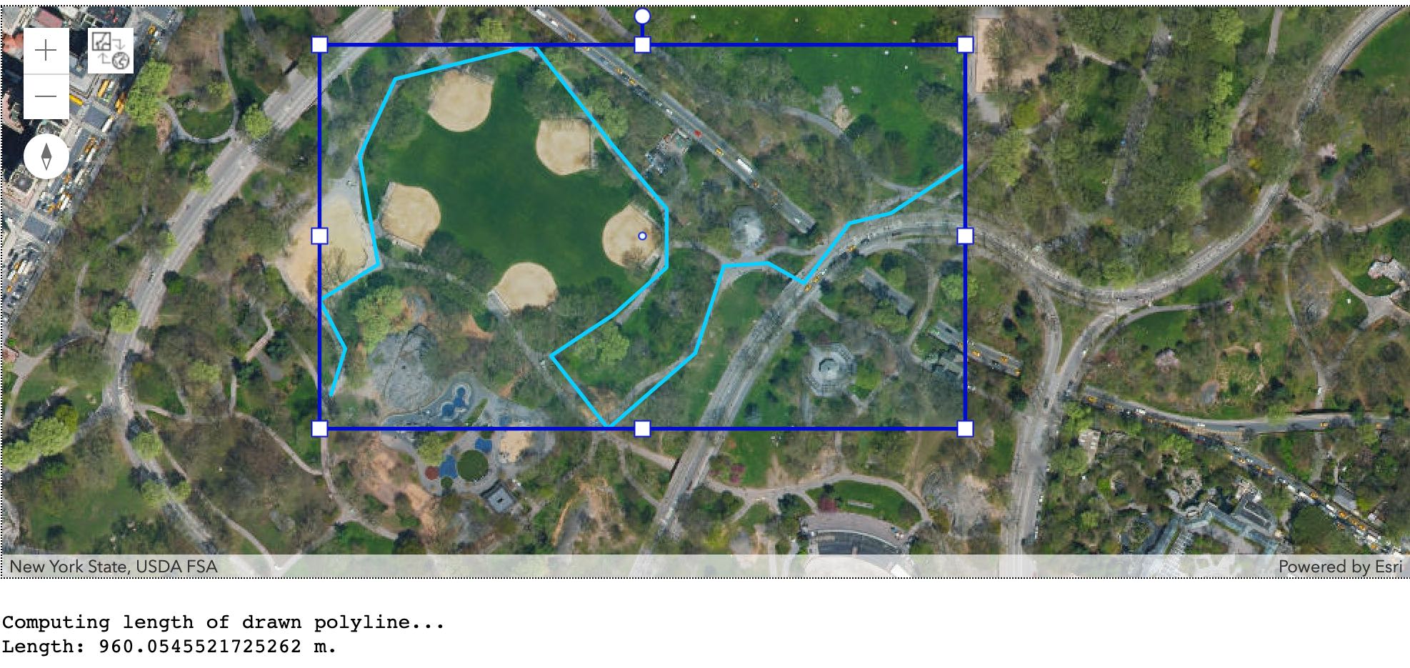 map1.draw(polyline) # would not draw anythingThat did not draw anything. Now, try a valid polyline geometry. In the example below, we specify coordinates in latitude and longitude and specify the coordinate system appropriately as GCS WGS 84 using the wkid 4326.