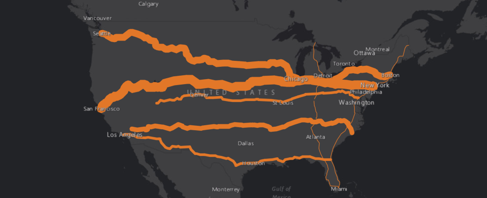 Besides adding in the the SeDF, we can also add a FeatureSet. For example, below we will search for the USA freeway layer and visualize it by adding it to the map widget as a FeatureSet object returned by the query method. Once added, we then draw it with default line symbols.