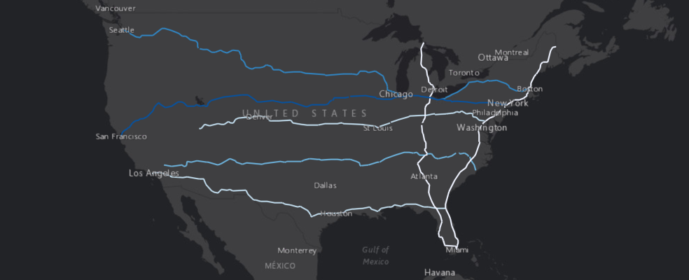 Besides adding in the the SeDF, we can also add a FeatureSet. For example, below we will search for the USA freeway layer and visualize it by adding it to the map widget as a FeatureSet object returned by the query method. Once added, we then draw it with default line symbols.