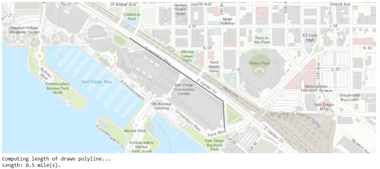 drawend_map = gis.map('San Diego convention center, San Diego, CA', 16)from arcgis.geometry import lengths
