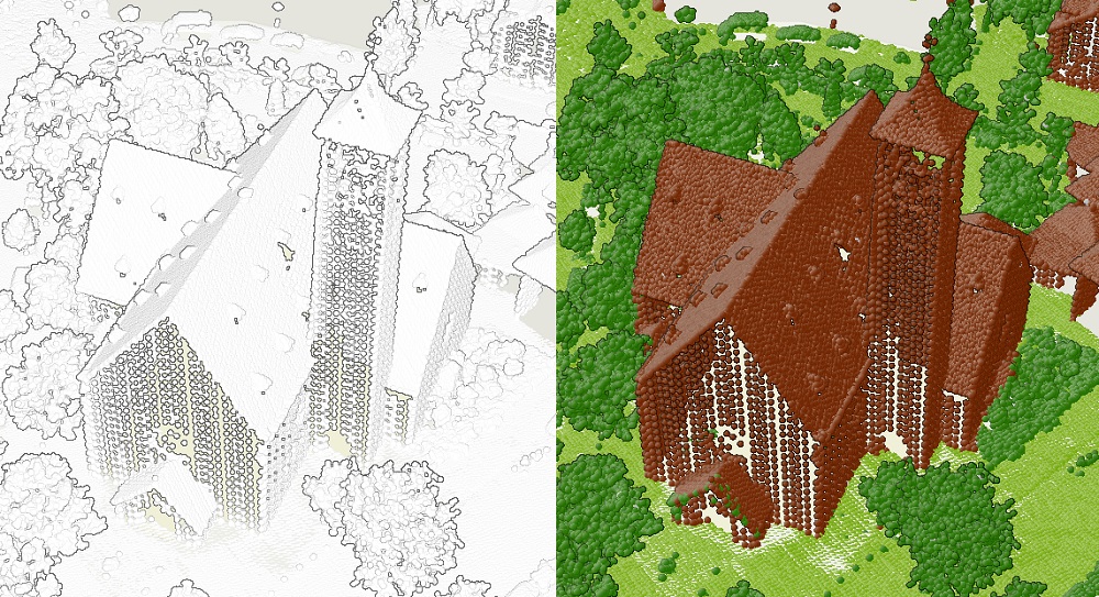 Figure 2. On the left side, raw LiDAR points can be seen. And for the same area, on the right side, we have classified points, where class codes are assigned to different colors