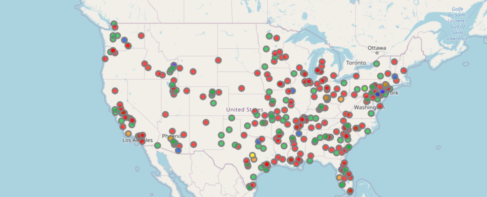 dtype='object')The ST column contains state names in abbreviation is a good candidate. We could symbolize the points such that all which fall under the same state get the same symbol: