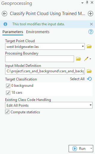 Additional features, like target classification and class preservation in input data, are also available. After the prediction, LAS files will have 'car points', with the class code '18', and the rest of the points will have the class code '0' (referred to as 'Background' in this sample). To visualize the results after the process is completed, the 'Symbology' can be changed to 'class' from the 'Appearance' tab, if not done initially.