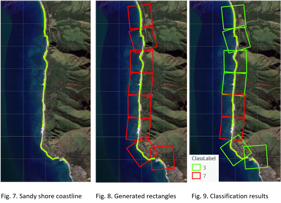 We selected an unseen (by the model) sandy shoreline (category 3) and generated the required rectangles along it using the Generate Rectangles Along Lines tool. We then used our model for classification. Below are the results that we got.