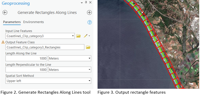 In order for us to perform inferencing in ArcGIS Pro, we need to create a feature class along the coastlines using the Generate Rectangles Along Lines tool, as shown in figure 2, for an area that is not already seen by the model.