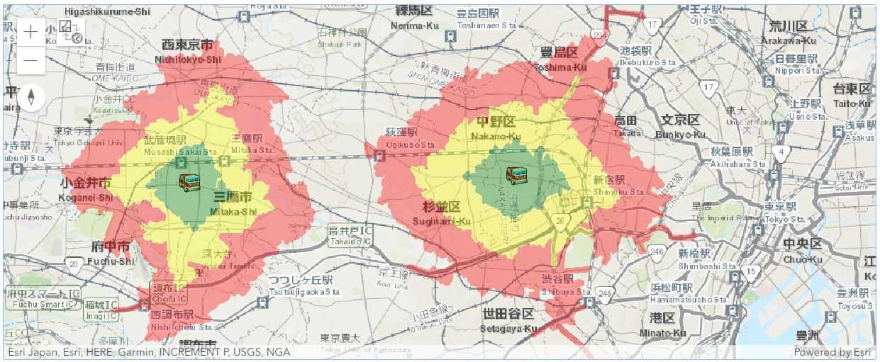 This sample shows how the network module of the ArcGIS API for Python can be used to construct service areas. In this sample, we generate service areas for two of the fire stations in central Tokyo, Japan. We later observe how the service area varies by time of day for a fire station in the city of Los Angeles.