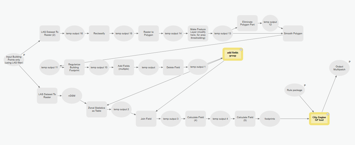 Then using multiple geoprocessing tools in ArcGIS Pro within a model builder, noises are cleaned and building footprints are generated. These footprints are later used to generate multipatches.
