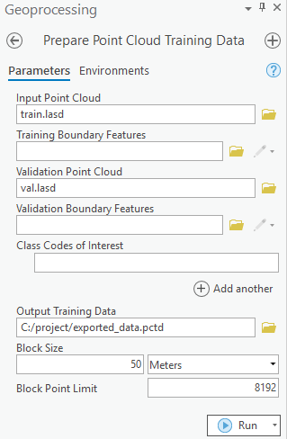 The tool needs two LAS datasets, one for the training data and one for the validation data or regions of interest defined by polygons. Next, the block size is set to '50 meters', as our objects of interest will mostly be smaller than that, and the default value of '8192' is used for block point limit.