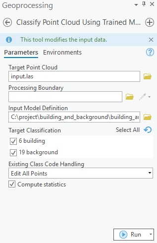 Additional features, like target classification and class preservation in input data, are also available. After the prediction, LAS files will have 'building points', with the class code '6', and the rest of the points will have the class code '19' (referred to as 'Background' in this sample). To visualize the results after the process is completed, the 'Symbology' can be changed to 'class' from the 'Appearance' tab, if not done initially.
