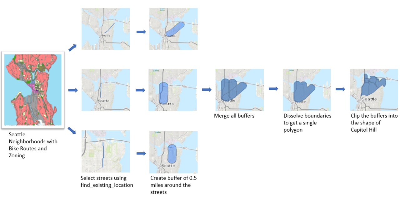 This sample uses ArcGIS API for Python to analyze and select streets for making bike routes for people commuting to and from work in the City of Seattle, Washington. It will demostrate the use tools such as find_existing_locations, create_buffers, merge_layers, dissolve_boundaries, overlay_layers, enrich_layer, and attribute query. We will also be using Esri Tapestry Segmentation to perform this analysis.