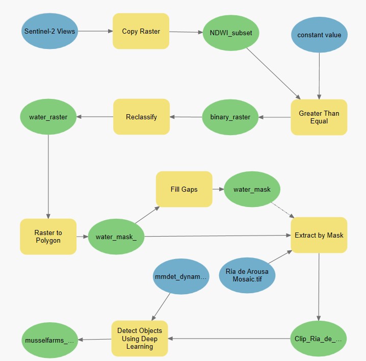To save time and resources, we will only run the model on the water body and not the surrounding land masses, as the mussel farms are only found in water. To extract a raster with only the water body, we created a water mask using the Sentinel-2 Views NDWI. The following model builder can be used to create a water mask and detect the mussel farms.