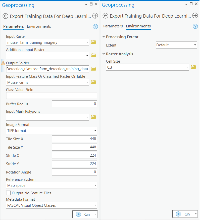 training_feature_layerTraining data can be exported by using the 'Export Training Data For Deep Learning' tool available in ArcGIS Pro and ArcGIS Enterprise. For this example, we prepared the training data in the 'PASCAL Visual Object Classes' format, using a 'chip_size' of 448px and a 'cell_size' of 0.3m, in ArcGIS Pro. The 'Input Raster' and the 'Input Feature Class' have been made available to export the required training data. We have also provided the exported training data in the next section, if you wish to skip this step.