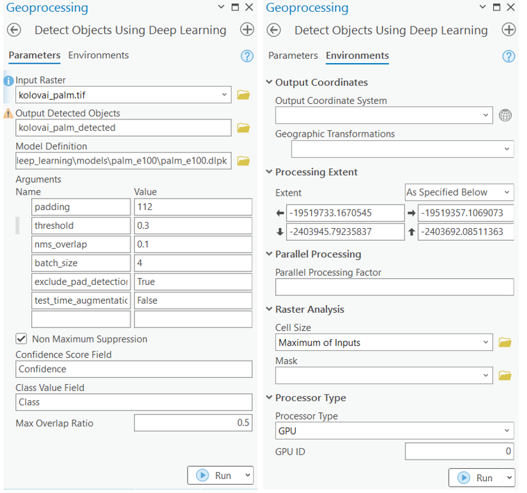 palm_labelTraining data can be exported by using the Export Training Data For Deep Learning tool available in ArcGIS Pro. For this example, we prepared the training data in the 'PASCAL Visual Object Classes' format, using a 'chip_size' of 448px and a 'cell_size' of 0.085, in ArcGIS Pro. The 'Input Raster' and the 'Input Feature Class' have been made available to export the required training data. We have also provided the exported training data in the next section, if you wish to skip this step.