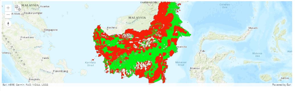 In the output, the red areas denote places that are less suitable for oil palm plantation, while green areas represent places that are more suitable.