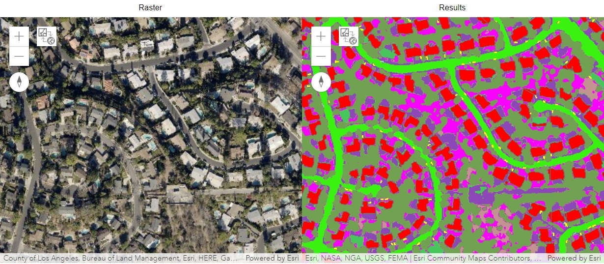 trained_modelIn this step, we will use the Detect Objects Using Deep Learning tool available in both ArcGIS Pro and ArcGIS Enterprise to generate a feature layer with detected buildings and cars and a classified raster with the LULC.