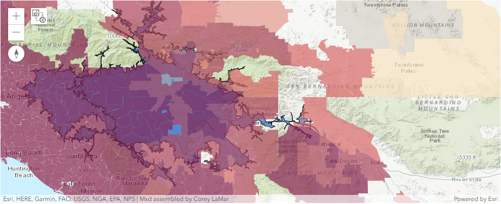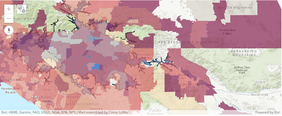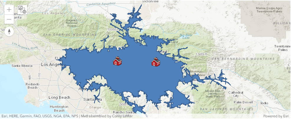 | 6 | 179 | 1 | 0 | US | -117.552830 | 34.064356 | NetworkServiceArea | Minutes | Drive Time Minutes | 45 | ... | CA | 91752 | Eastvale | 8.270909 | 503800 | 0.064508 | 5.733285e+07 | 37863.197705 | 39.309396 | {"rings": [[[-13082747.7254, 4033299.2511], [-... |