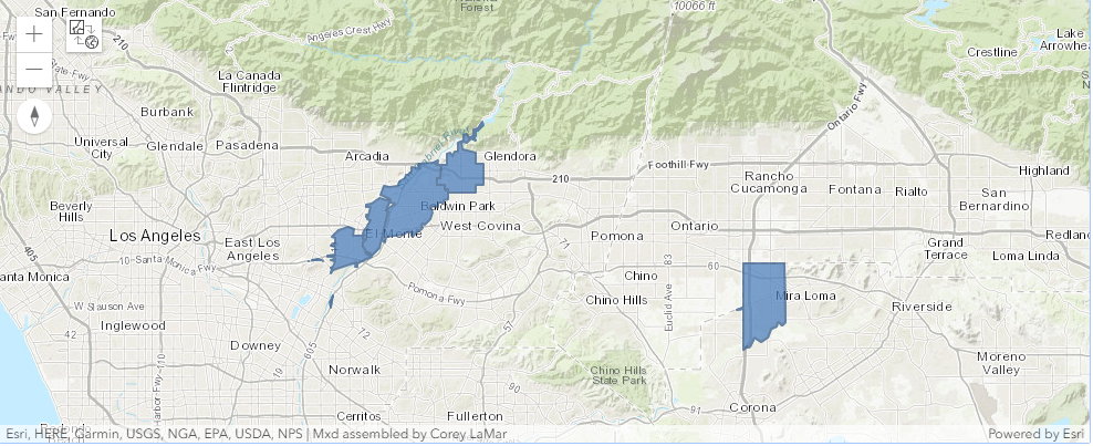 | 0 | 6 | 1 | 0 | US | -117.552830 | 34.064356 | NetworkServiceArea | Minutes | Drive Time Minutes | 45 | ... | CA | 90606 | West Whittier-Los Nietos | 8.272251 | 485500 | 0.072375 | 1.417656e+07 | 22316.323033 | 2.240247 | {"rings": [[[-13143194.2534, 4028915.1404], [-... |