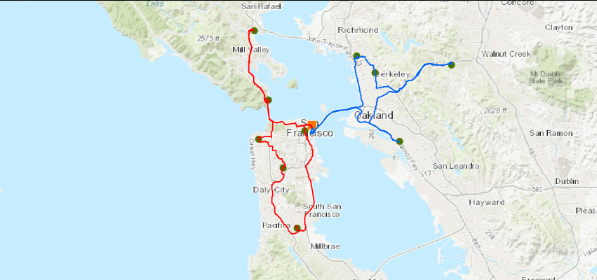 The network module of the ArcGIS API for Python can be used to solve different types of network analysis operations. For example, an appliance delivery company wants to serve multiple customers in a day using several delivery drivers, a health inspection company needs to schedule inspection visits for the inspectors. The problem that is common to these examples is called vehicle routing problem (VRP). Each such problem requires to determine which orders should be serviced by which vehicle/driver and in what sequence, so the total operating cost is minimized and the routes are operational. In addition, the VRP solver can solve more specific problems because numerous options are available, such as matching vehicle capacities with order quantities, giving breaks to drivers, and pairing orders so they are serviced by the same route.