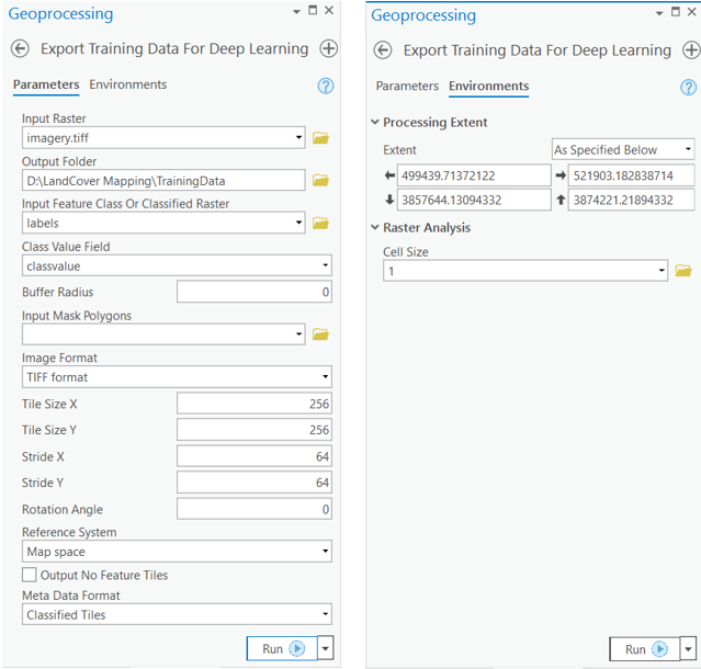 Input Raster: NAIP imageryInput Feature Class Or Classified Raster: feature layer containing labeled polygonsClass Value Field: field containing class values against each classTile Size X & Tile Size Y: 256Stride X & Stride Y: 64Meta Data Format: 'Classified Tiles' as we are training an segmentation Model which in this case isUnetClassifier.Environments: Set optimumCell Size,Processing Extent.