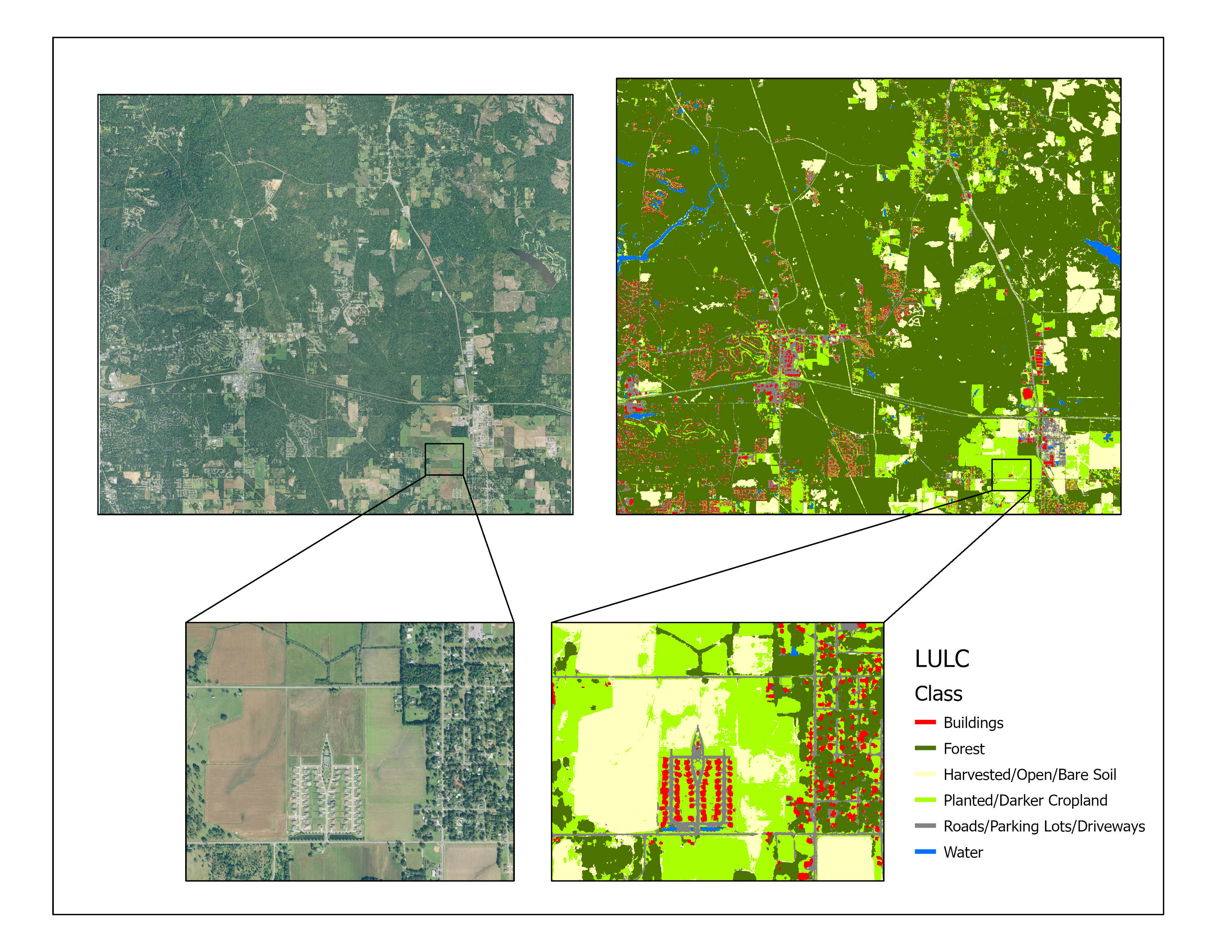 We have labelled a few training polygons in the northern regions of Alabama state. The training data has the polygons labelled for six land cover classes namely 'buildings', 'roads and parking lots', 'water', 'harvested, open and bare lands', 'forest' and 'planted crops'. We need to classify NAIP imagery against these land cover classes.