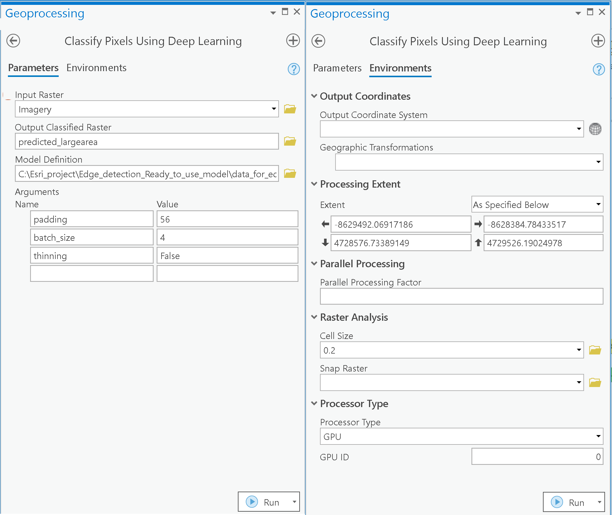 alpha: controls the opacity of predicted edges. Set to 1.thinning: Its a post-processsing parameters, which thins or skeletonizes the predicted edges. We will be using our own pre-processing workflow build in ArcGIS pro hence, will set it to False. As per results, this could also be set to True/False during inferencing in pro.