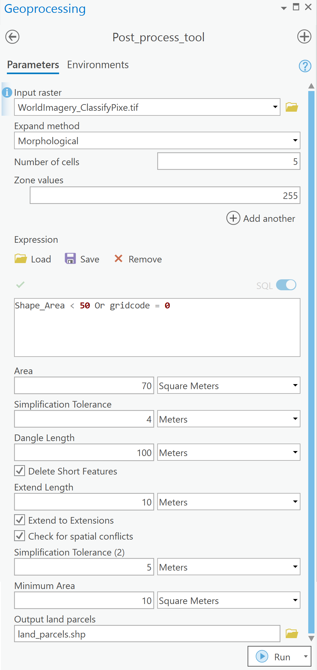 As postprocessing workflow below involves geoprocessing tools and the parameters set in these tools need to be experimented with to get optimum results. We would use model builder to build this workflow for us and which will enable us to iteratively change the parameters in this workflow. The Input raster should be a predicted reclassified raster with 0-255 range pixel value.