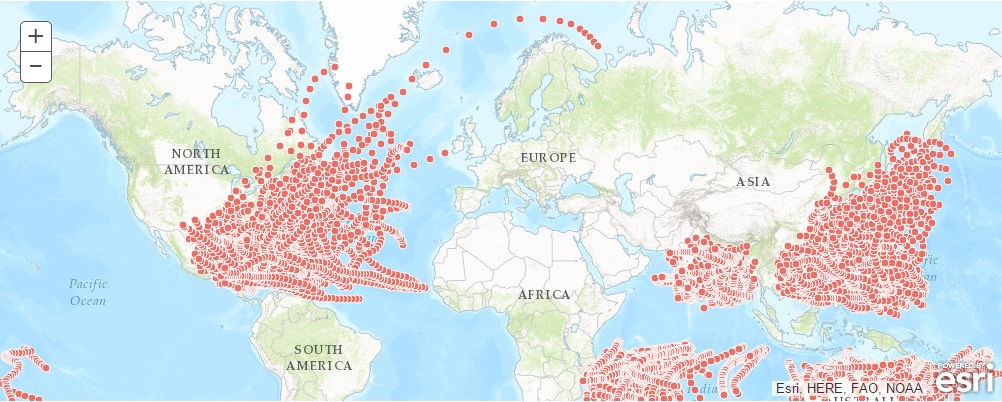 The data collected so far are a set of Point observations representing all hurricanes recorded in the last 169 years. To make sense of these points, we need to connect them together to create a track for each hurricane. This part of the notebook uses ArcGIS GeoAnalytics server to reconstruct such hurricane tracks. The GeoAnalytics server is capable of processing on massive datasets in a scalable and distributed fashion.