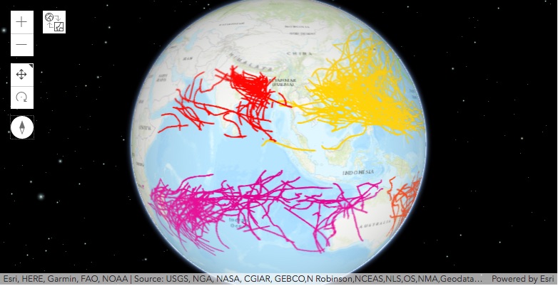 The map above draws a set of 500 hurricanes chosen at random. You can visualize the Spatially Enabled DataFrame object with different types of renderers. In the example above a unique value renderer is applied on the basin column. You can switch the map to 3D mode and view the same on a globe.