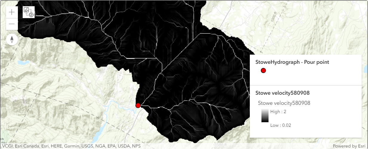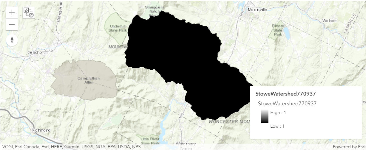 m9.zoom_to_layer(stowe_watershed)m9.legend = TrueYou've determined how water will flow throughout Stowe, Vermont. Based on your results, you snapped your outlet point to the location of the Little River in your DEM. From your flow direction layer and your outlet point, you determined the location of the watershed upstream of the town. Next, you'll use several of your hydrologic and elevation layers to determine how fast water will flow to the outlet point.