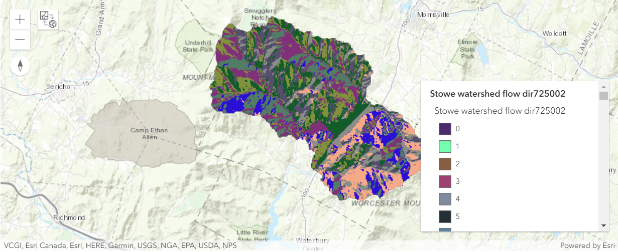 stowe_watershed_flow_dir_colormap = colormap(stowe_watershed_flow_dir.layers[0], colormap_name="Random")m15 = gis.map('Stowe, Vermont')