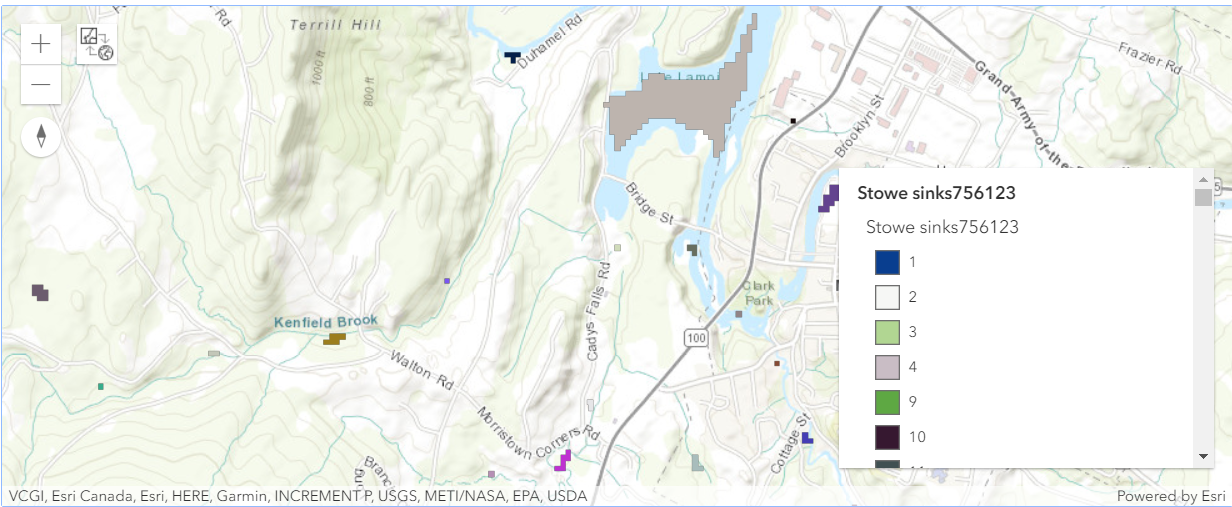 m3.zoom_to_layer(stowe_sinks)m3.legend = Truefrom arcgis.raster.functions import colormap, stretchstowe_sinks_colormap = stretch(stowe_sinks.layers[0], dra=True)m4 = gis.map('Stowe, Vermont')
