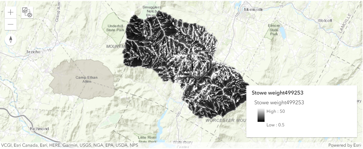 stowe_sinks = sink(stowe_flow_direction.layers[0]).save('Stowe_sinks' + str(dt.now().microsecond))stowe_sinksm3 = gis.map('Stowe, Vermont')