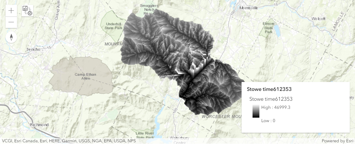 input_weight_raster=stowe_weight.layers[0]).save('stowe_time' + str(dt.now().microsecond))Each cell in this raster layer contains a value that represents the time in seconds for water to flow to the outlet from the cell. Darker colors represent shorter flow times. Water takes the least amount of time to flow from the low-lying stream beds closest to the outlet, while water falling in the western mountains takes longer.