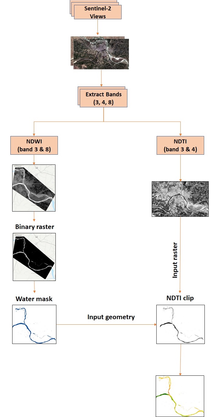 Green (band 3), Red (band 4) and NIR (band 8) bands were extracted from the Sentinel-2 tiles for NDWI and NDTI calculation.