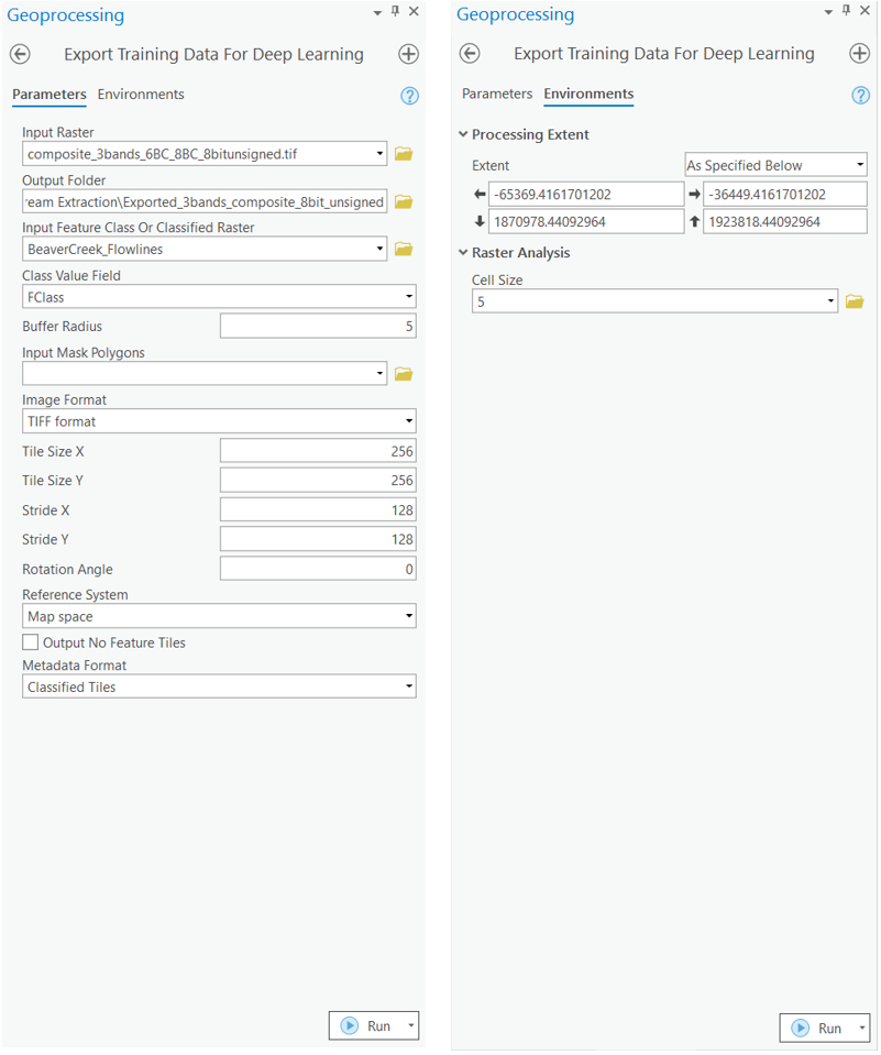 arcpy.ia.ExportTrainingDataForDeepLearning("composite_3bands_6BC_8BC_8bitunsigned.tif", r"D:\Stream Extraction\Exported_3bands_composite_8bit_unsigned", "BeaverCreek_Flowlines", "TIFF", 256, 256, 128, 128, "ONLY_TILES_WITH_FEATURES", "Classified_Tiles", 0, "FClass", 5, None, 0, "MAP_SPACE", "PROCESS_AS_MOSAICKED_IMAGE", "NO_BLACKEN", "FIXED_SIZE")